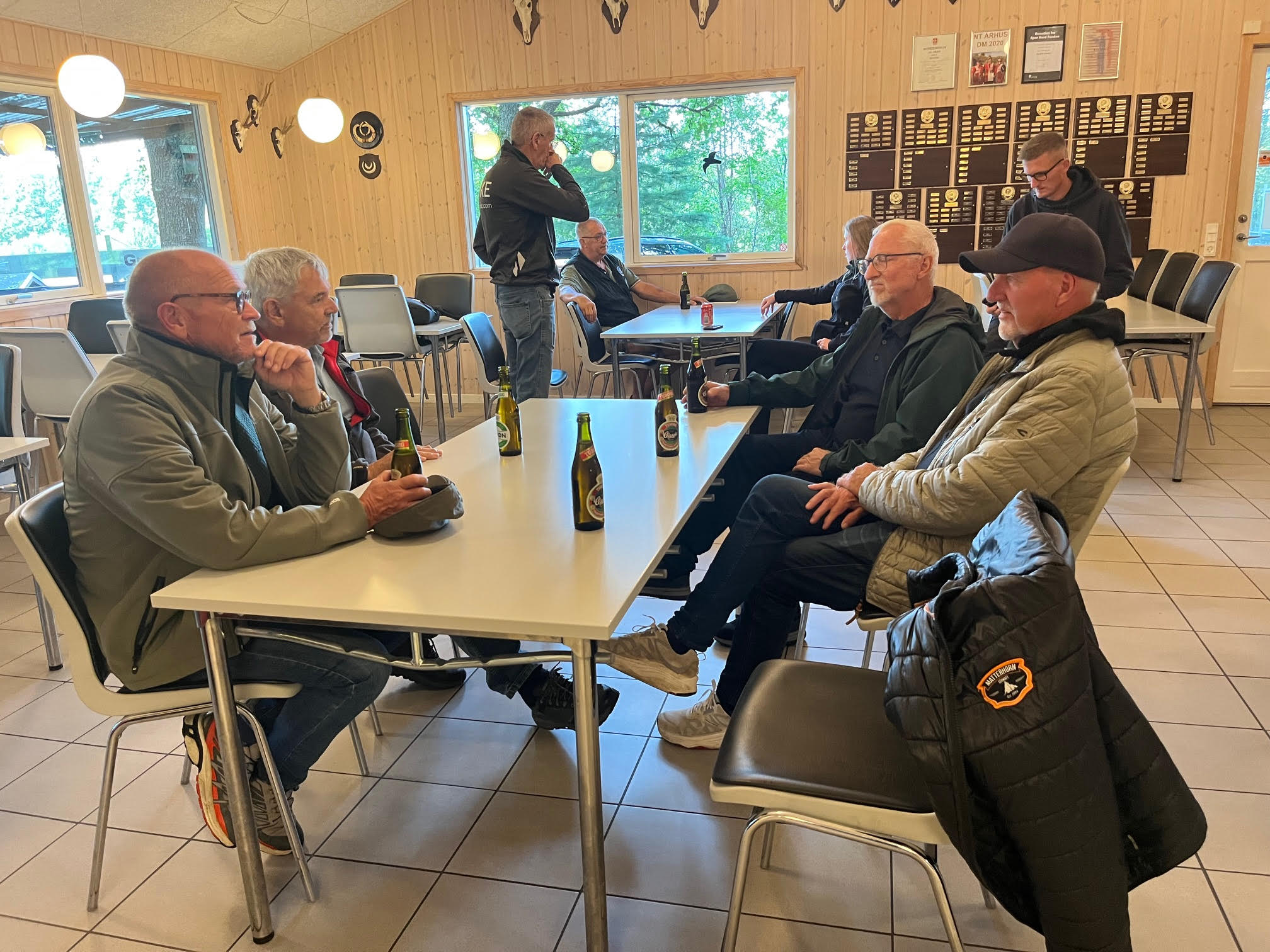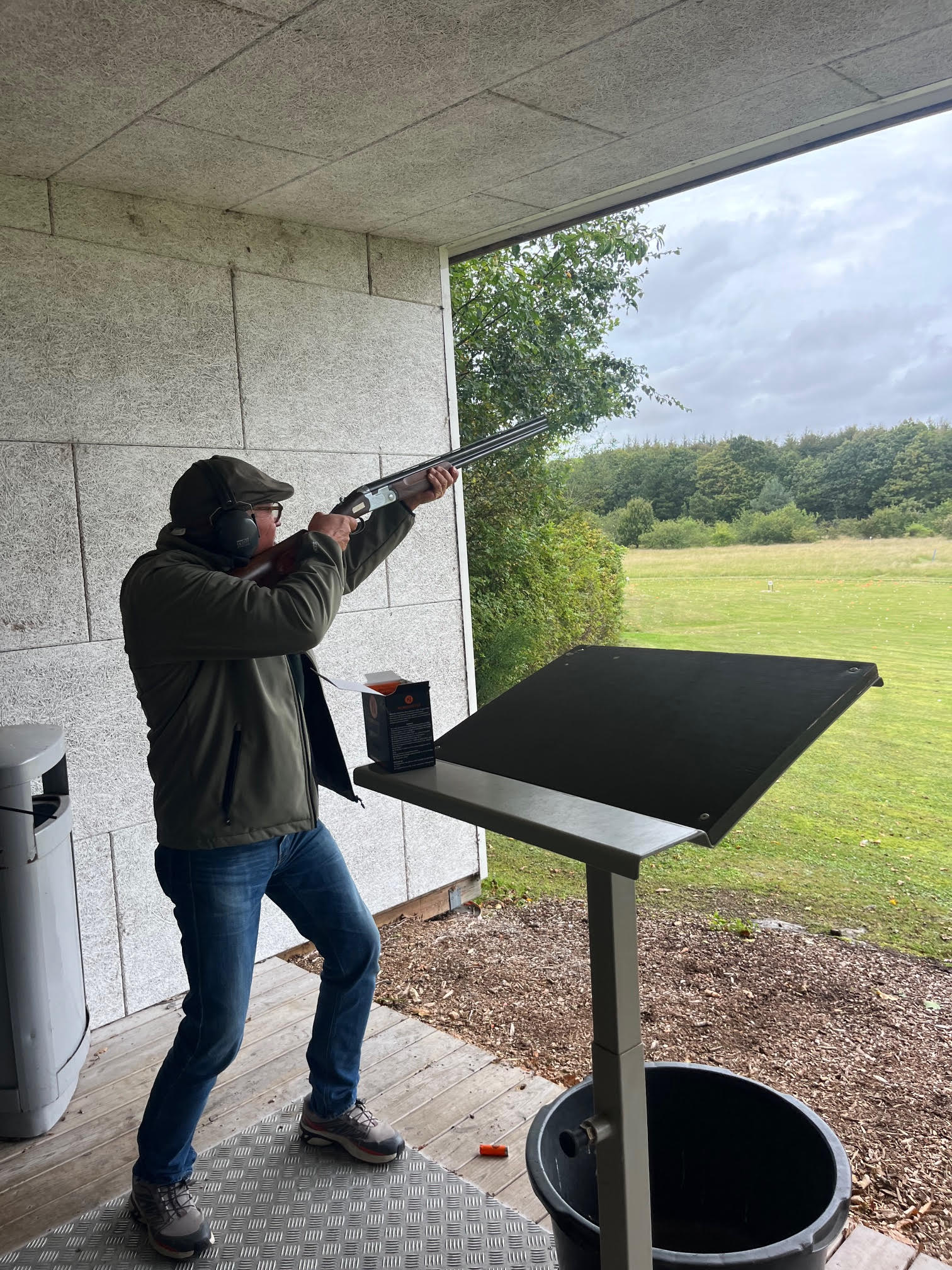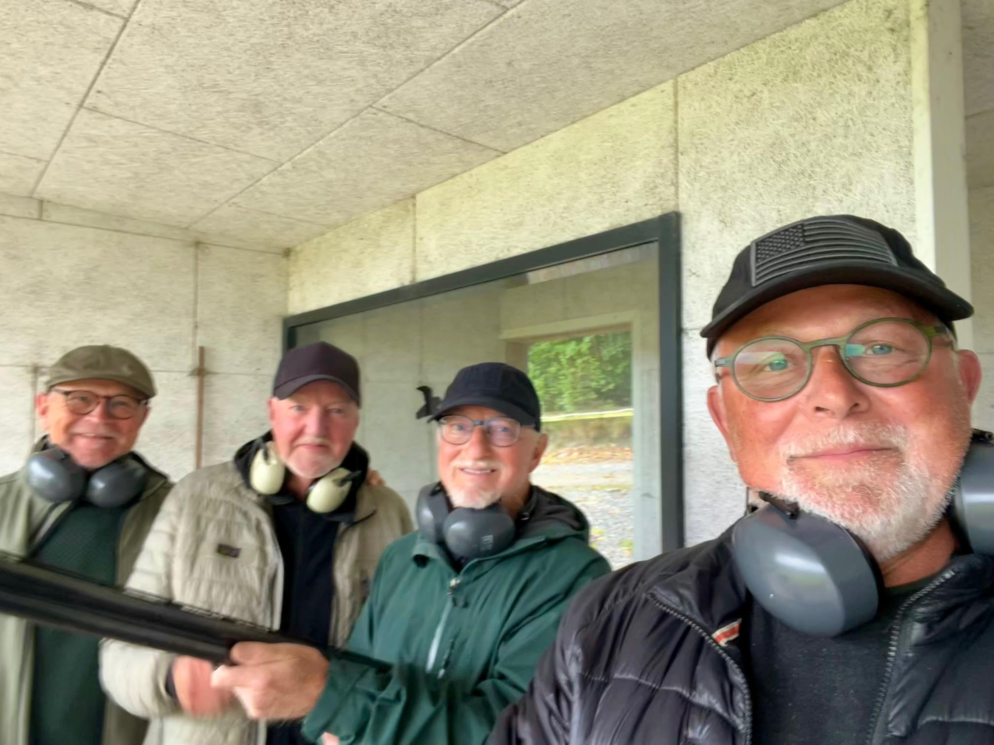 Flugtskydning i Sønderhede. (Esbjerg Flugtskydningsforening) Først lækker frokost i Hjerting. Diverse sild, laks, varm leverpostej, oste. Siden kaffe og hjemmelavet æblekage. Derefter en fantastisk eftermiddag i solskin, på flugtskydningsbanen, under kyndig vejledning af Poul Lehmann Jakobsen.